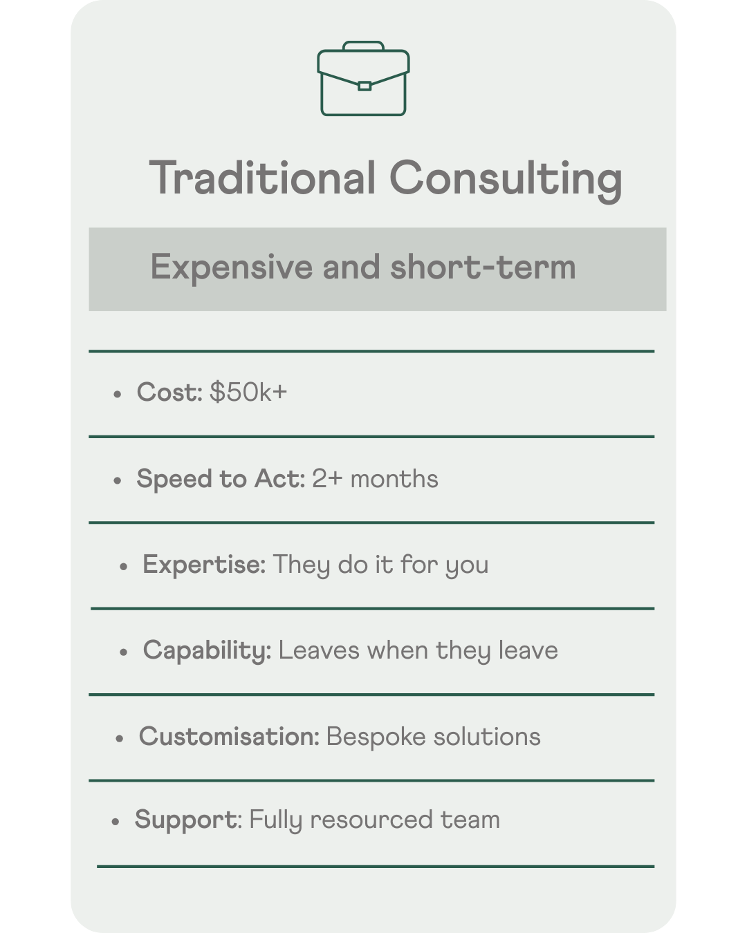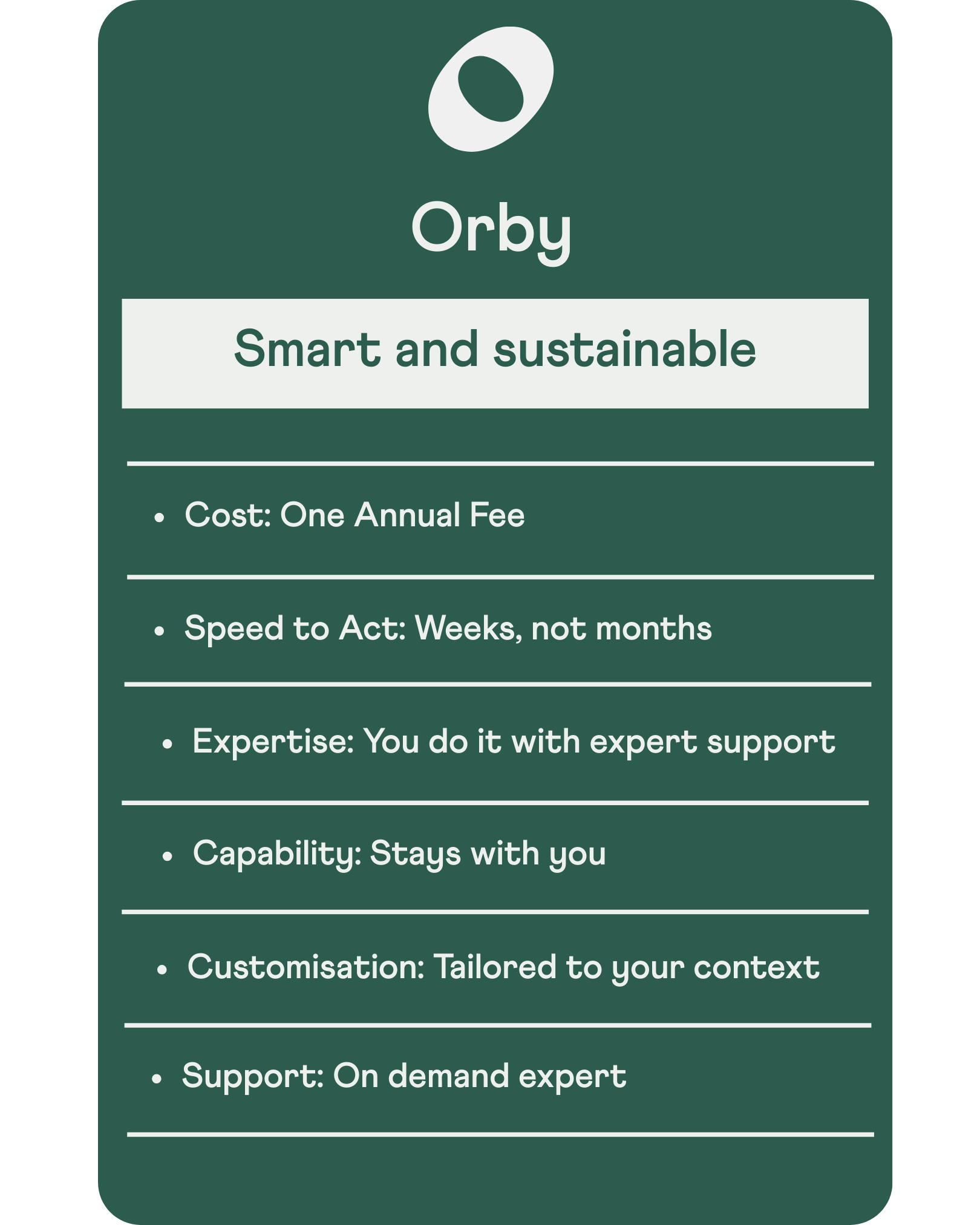 Consultants do the work for you - and take their expertise with them when they leave. Orby gives you the frameworks, tools and support to do the work yourself. You build capability that stays with your organisation.